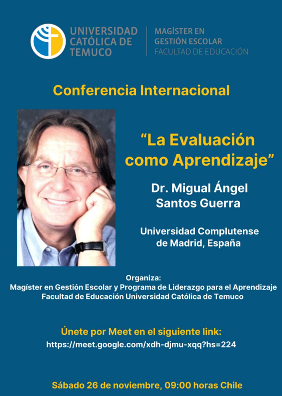El recién pasado sábado 26 de noviembre de 2022, el programa del Magíster en Gestión Escolar realiza un seminario híbrido de difusión de investigaciones sobre liderazgo pedagógico que desarrollan estudiantes durante su trabajo de grado. En este contexto, el Doctor Miguel Ángel Santos Guerra realizó la conferencia ‘Evaluación como aprendizaje’ de nivel mundial para alrededor de 100 personas entre estudiantes, graduados y académicos del programa. El Maestro Santos Guerra es Doctor en Ciencias de la Educación, catedrático de la Universidad de Málaga (España) y autor de numerosos libros sobre organización escolar, evaluación educativa, dirección escolar y formación del profesorado.