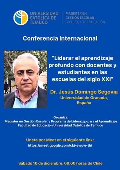 El recién pasado sábado 10 de diciembre de 2022, el programa del Magíster en Gestión Escolar realiza la última conferencia internacional denominada “Liderar el aprendizaje profundo con docentes y estudiantes en las escuelas del siglo XXI” a cargo del Doctor Jesús Domingo Segovia, director del Programa de Doctorado en Ciencias de la Educación de la Universidad de Granada. El experto Domingo-Segovia durante la actividad mantuvo un diálogo reflexivo y participativo junto a docentes y estudiantes del programa sobre liderazgo de aprendizaje profundo.