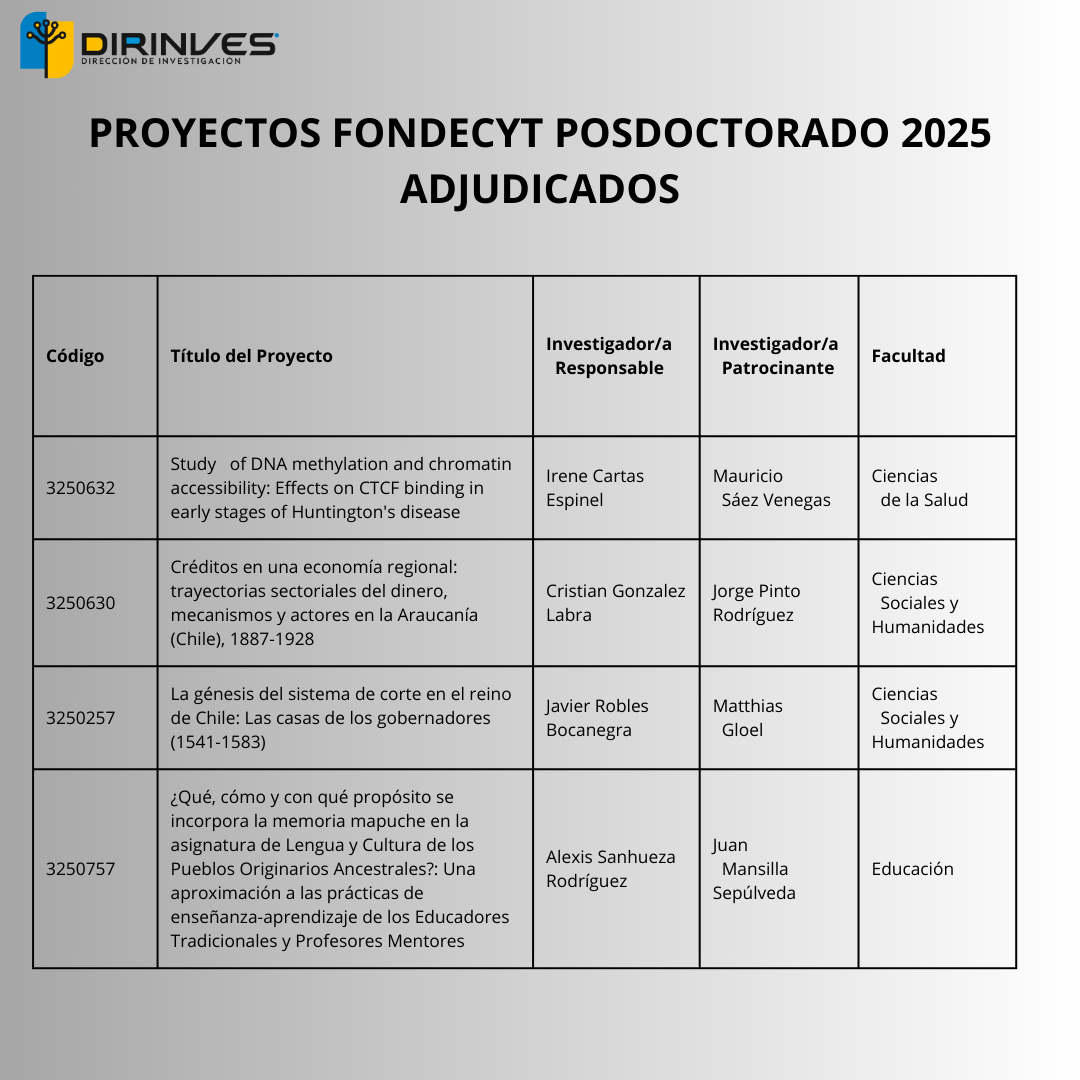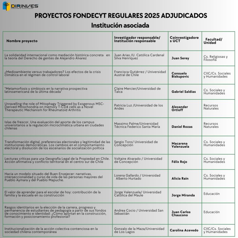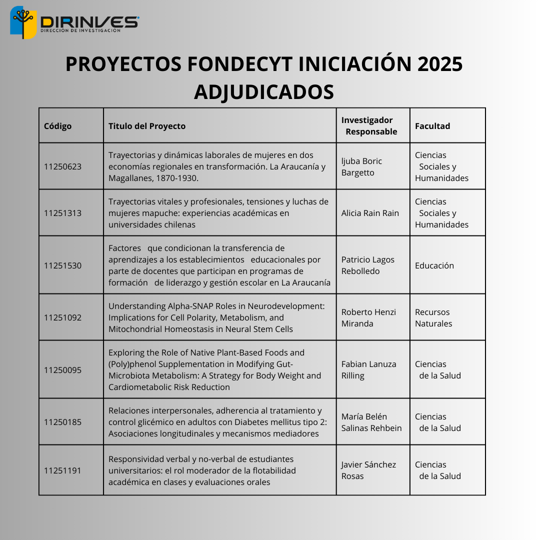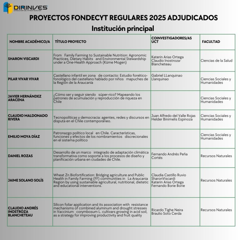 De los ocho Fondecyt Regular adjudicados cuatro corresponden a investigadores e Investigadoras de la Facultad de Ciencias Sociales y Humanidades: Pilar Vivar, Javier Hernández, Claudio Maldonado y Emilio Moya; tres a la Facultad de Recursos Naturales de los académicos Daniel Rozas, Jaime Solano y Claudio Inostroza; y un proyecto de la investigadora Sharon Viscardi de la Facultad de Ciencias de la Salud. A esto se suman los 11 investigadores/as que participan como coinvestigadores en proyectos a lo largo de todo el país.